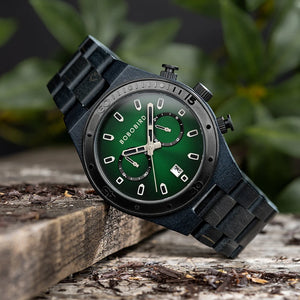 Reconnect with nature and time in perfect harmony with the Emerald Timber Timepiece. Crafted with a bold green dial and a sustainably sourced dark wooden strap, this watch blends earthy elegance with modern design. Housed in a rustic wooden box, it makes a thoughtful gift or a standout addition to your collection. Whether you're venturing outdoors or navigating the city, this eco-conscious chronograph keeps you grounded and stylish, every second of the way.
